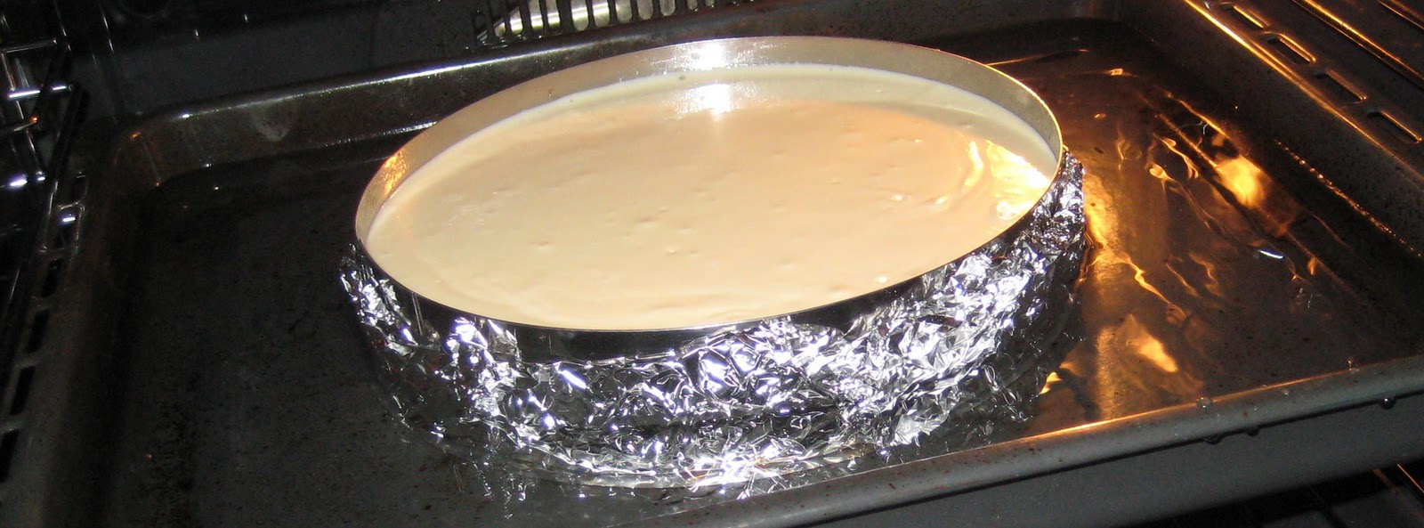 Entonces, ponemos agua en la bandeja de horno, precalentamos y una vez esté el agua caliente ponemos dentro de la bandeja el molde, que cubrimos con papel de aluminio para que no se filtre agua en su interior (nuestro molde es desmontable).